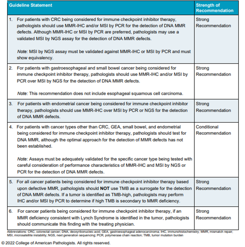 83. CAP. Mismatch Repair and Microsatellite Instability Testing for Immune Checkpoint Inhibitor Therapy. College of American Pathologists. Updated August 3, 2022. https://www.cap.org/protocols-and-guidelines/cap-guidelines/current-cap-guidelines/mismatch-repair-and-microsatellite-instability-testing-for-immune-checkpoint-inhibitor-therapy